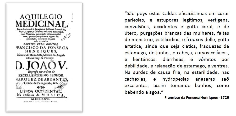 “São estas ágoas tão eficazes em curar os achaques frios de nervos, que excedem a quantas Caldas temos em Portugal, e às de Ledeima em Castella. Em algum tempo houve casa de banhos no mesmo sítio das Caldas; mas na guerra da feliz acclamaçaõ delRey D. João IV as mandou desnecessariamente demolir o conde de Mesquitella, que governava as armas daquela Província; deyxando privados os doentes do benefício das Caldas; de tal maneyra que da mesma província, e da mesma terra das Caldas, estavaõ indo às de Ledeima buscando o remedio que deyxavam em suas casas, ou às suas portas, pelo esquecimento em que ficaraõ depoys que naõ houve casa de banho em que se usassem; até que nós as lembramos, porque vendo a qualidade, e copia das agoas, que nos pareceraõ excelentes para os ditos achaques, aconselhàmos a alguns doentes que tomassem banhos em tinas, com que se curavaõ felizmente. A primeyra pessoa que de distancia de sete legoas fizemos ir a estas Caldas, foy huma mulher nobre, já quadragenária, que havia anos estava com huma parlisia universal, de forte lesa, que só a língua movia, e falava.Entrou a tomar banhos de tina; e no terceyro se restituio o movimento de maneyra que andou pela casa, e continuando com elles, sarou perfeytamente. Este caso fez resucitar estas Caldas por ser esta pessoa conhecida em toda a Provincia e assim foy havendo concurso a ellas com admiraveys sucessos.